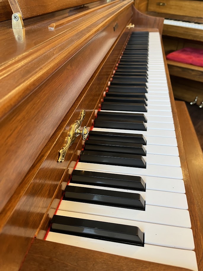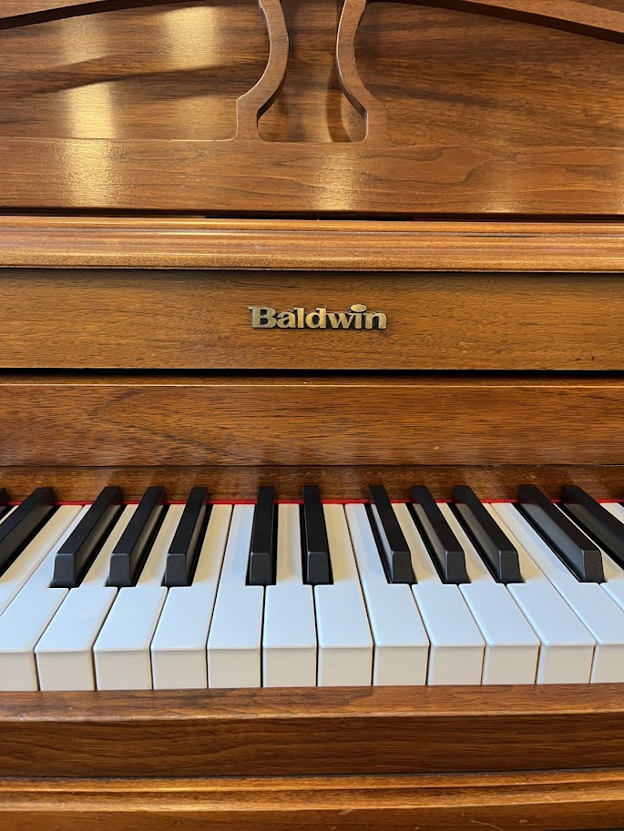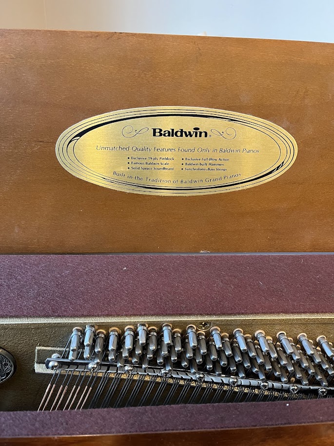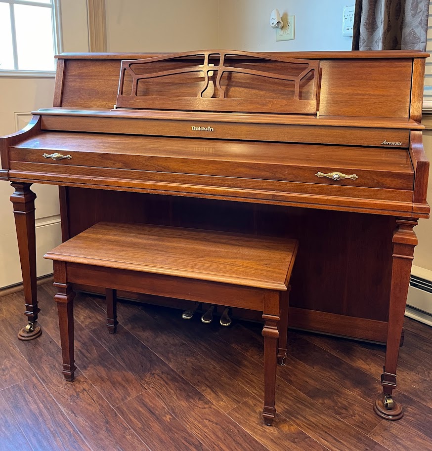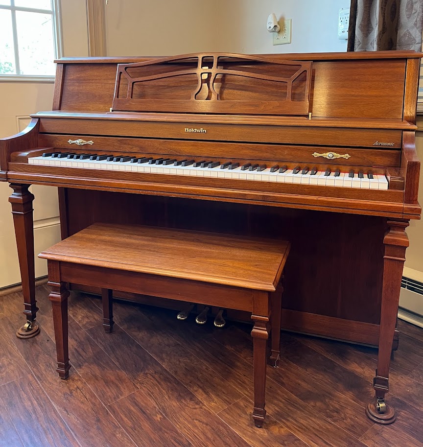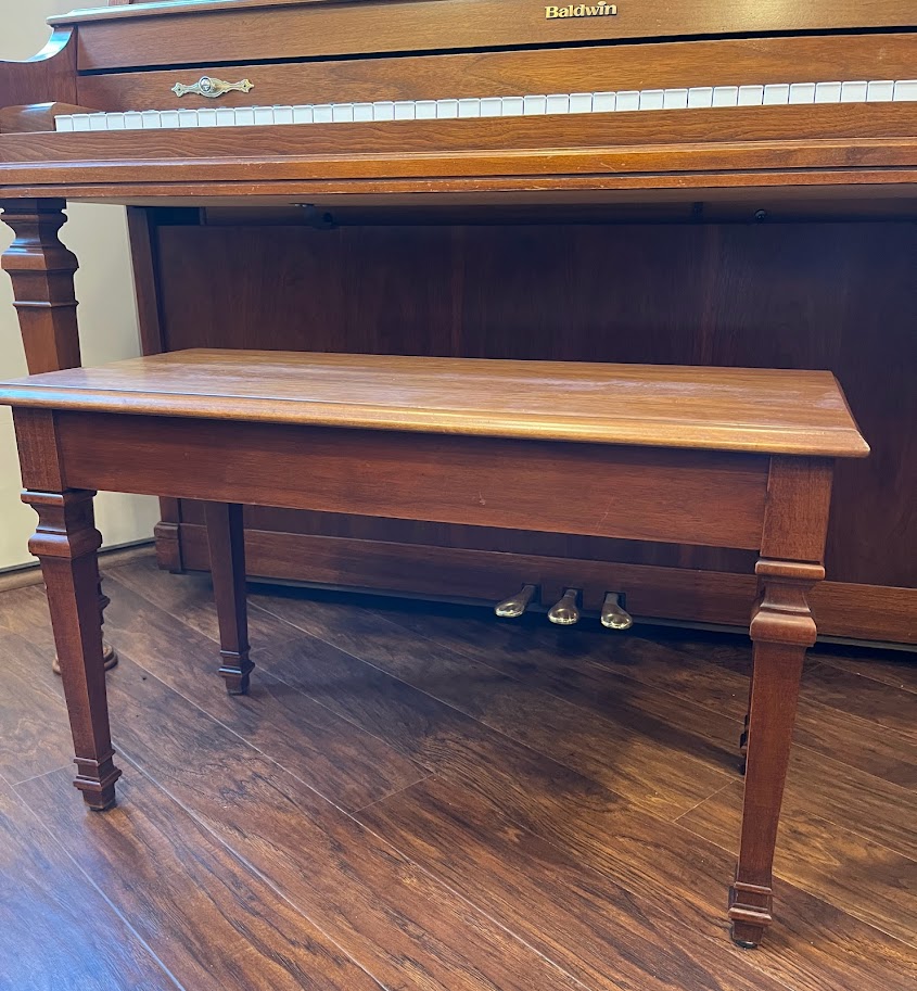 This Baldwin Acrosonic console was built in 1989. It has a cherry finish, and it comes with a matching bench. Upon purchase, you will receive 1 free tuning in home within 30 days of purchase. There is a 5 year warranty on this product.